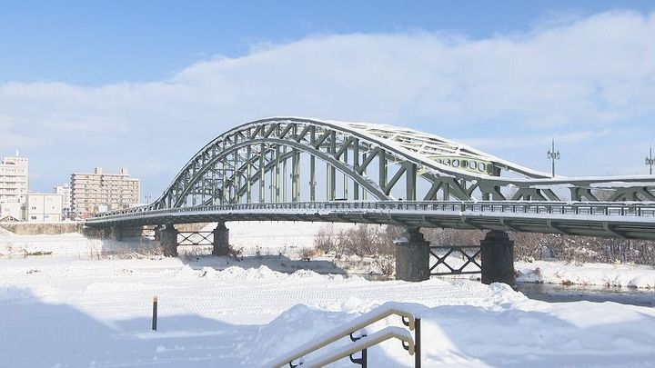 旭橋はアーチの曲線が特徴で、1932年に当時の最新技術をもって、石狩川に架けられました。