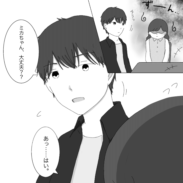 自分自身の行動を思い出していたたまれない気持ちになり落ち込むミカ、それを見たアツシが、「ミカちゃん、大丈夫?」と声をかけ、「あっ・・はい」ミカはなんとか答えたのでした。