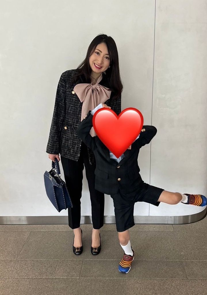 「式用の服は普段着にも多いパンツスタイルに。変形ジャケットが気に入って買ったセットアップですが、丈が長めのフレアタイプだったので、しゃがんだときも腰まわりが気になりませんでした。中にフリルブラウスを着ても下が黒パンツだと甘すぎずに着こなせた気がします」平野友香さん/42歳・主婦(12歳の女の子と7歳の男の子ママ)