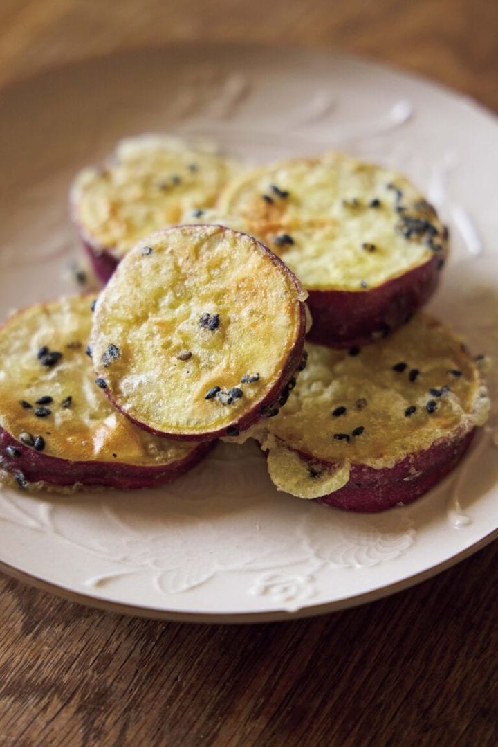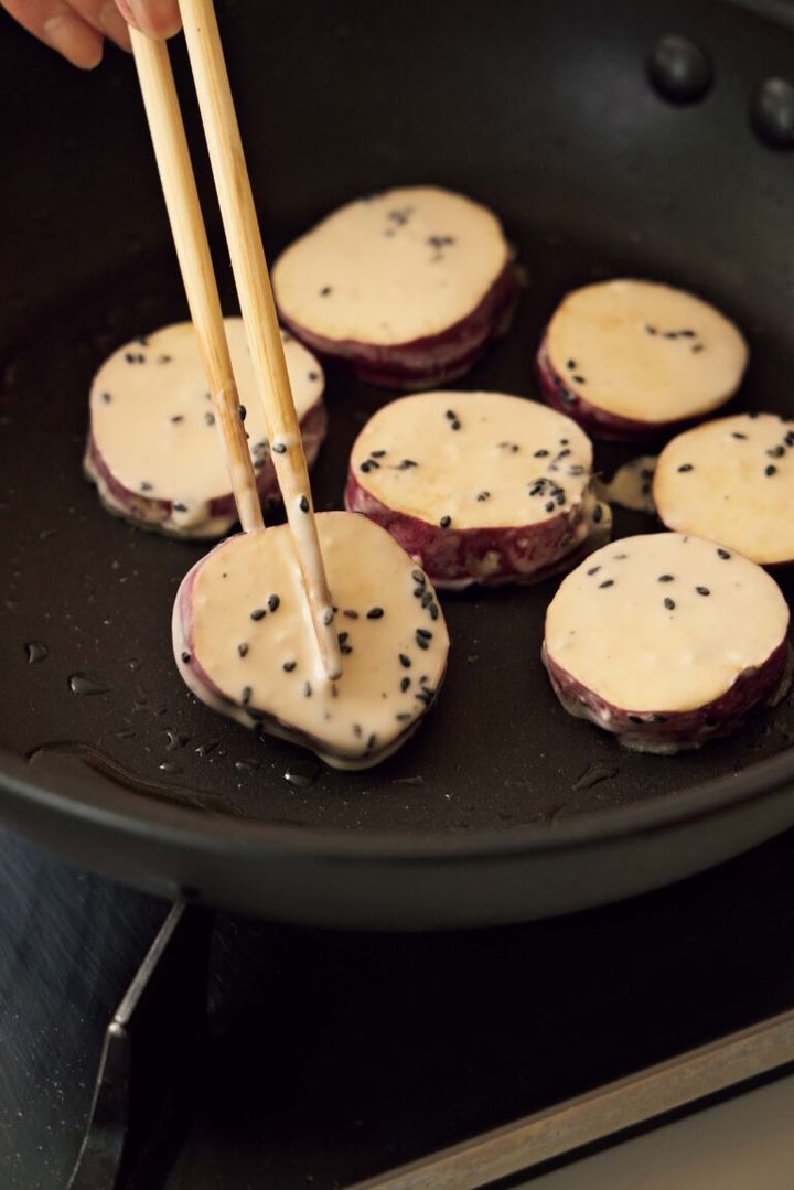 さつまいもの焼き時間は目安なので、甘みをより引き出したいときは、20 分ほどじっくり焼いても◎。好みに合わせて、調整してみてください。衣が余ったら、衣だけを焼いて黒ごまチヂミにしてもいいですし、かぼちゃやれんこんを厚さ1 ㎝に切って、同じようにジョンにするのも美味です。