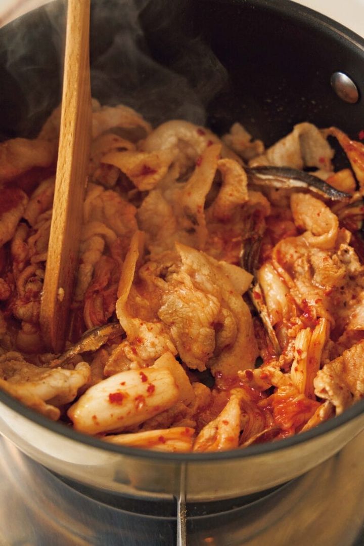 “キムチ”と“おから”は腸の調子を整えてくれる働きがあり、腸活にも最適な食材です。おからチゲには、発酵が進んだ酸味の強いキムチとジューシーな豚バラ肉がよく合うので、ぜひお試しください。キムチを加熱する際は軽く炒めてから煮て、旨みを凝縮させましょう。