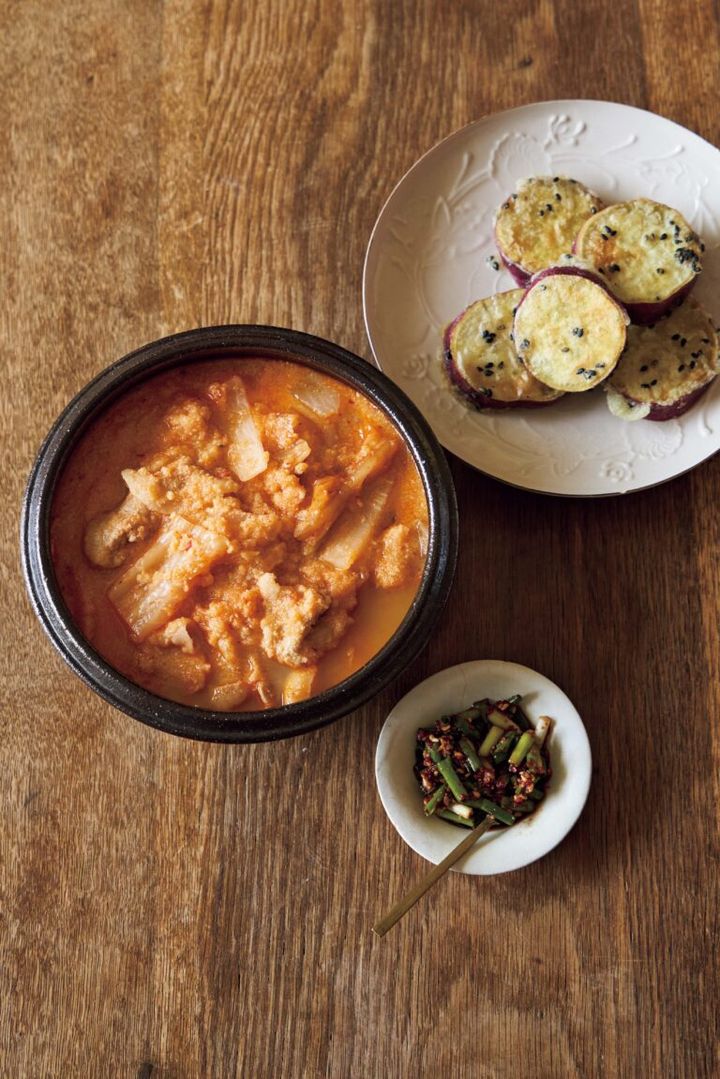 副菜には、素材の甘みでチゲの辛さをやわらげてくれる〝さつまいものジョン〟を。衣に黒いりごまを加えることで、見た目と食感のアクセントになりますよ」