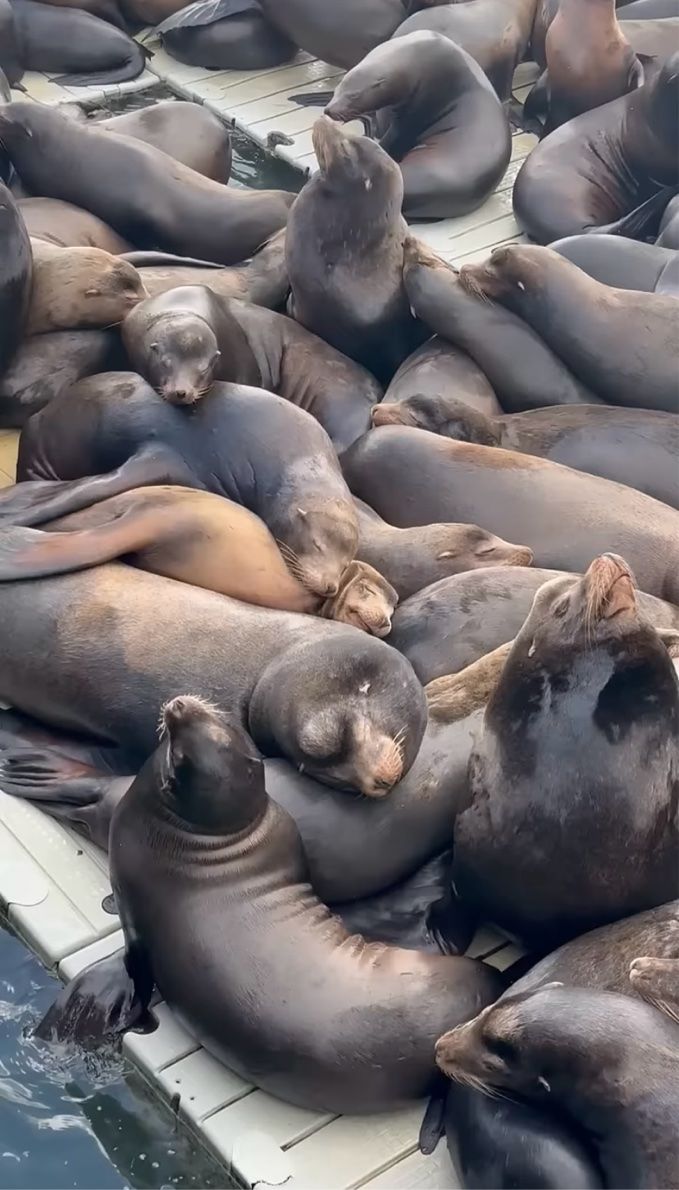 港のドックの上をお昼寝スポットにしていたアシカの群れ。 どこからともなく鳴き声が響き渡っていますが、ほとんどの子が重なり合うように身を寄せて眠っています。