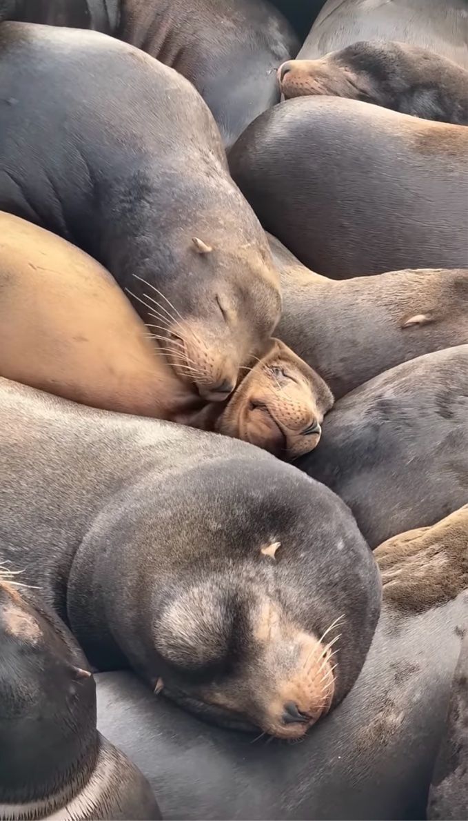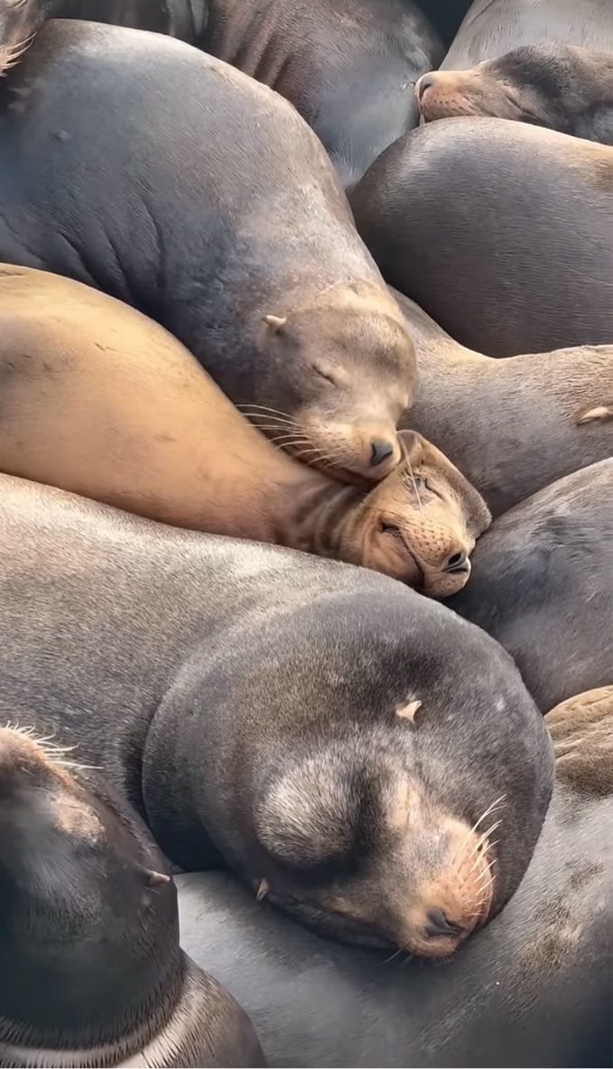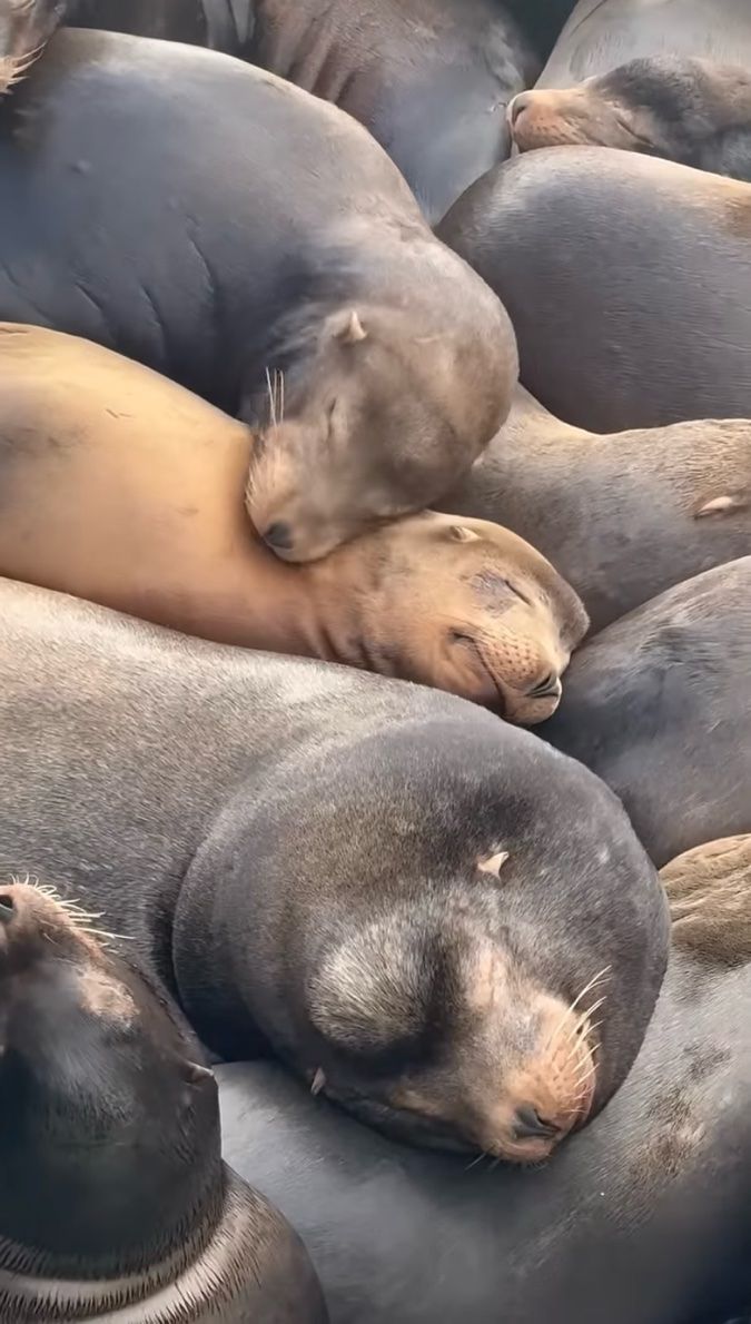 港のドックの上で気持ちよさそうにお昼寝中のアシカの群れ。 その中に、仲良く頬ずりして眠る子たちの姿がありました!