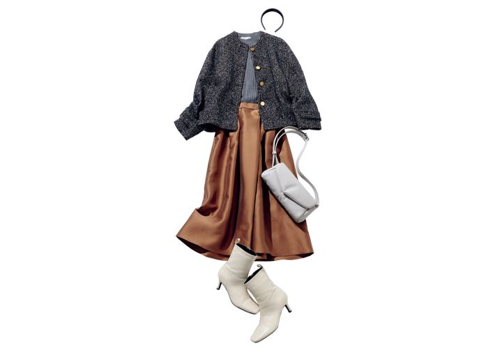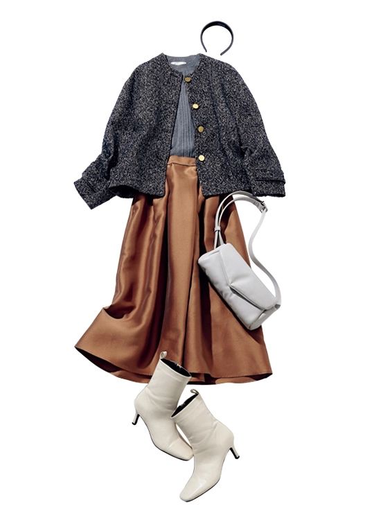 おめかし感もほどよく出せるツイードとツヤツヤスカートの可愛げコーデ。服の色を選ばず使えるグレージュバッグ&白ブーツがコーデのアクセントに。ベーシックなカラーでまとめればやりすぎ感がなく、オフィスにもなじむ!