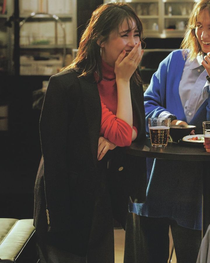 1月24日(金)、退勤後にディナーを控えた週末。オフィスにもなじむジャケパンコーデで真面目なムードに引き締めつつ、細部に品格や華やぎのあるアイテムを取り入れて、夜はドレッシーな雰囲気に味変を。ジャケットは大きめサイズで肩がけしたり、メタリックボタンや黒を選んでシックにキメるのがコツです。ボトムスは格子柄のグレーパンツでトラッドに仕上げて。顔周りをパッと明るくさせる赤ニットを合わせることで、ムードがある場所でも存在感が引き立ちます。