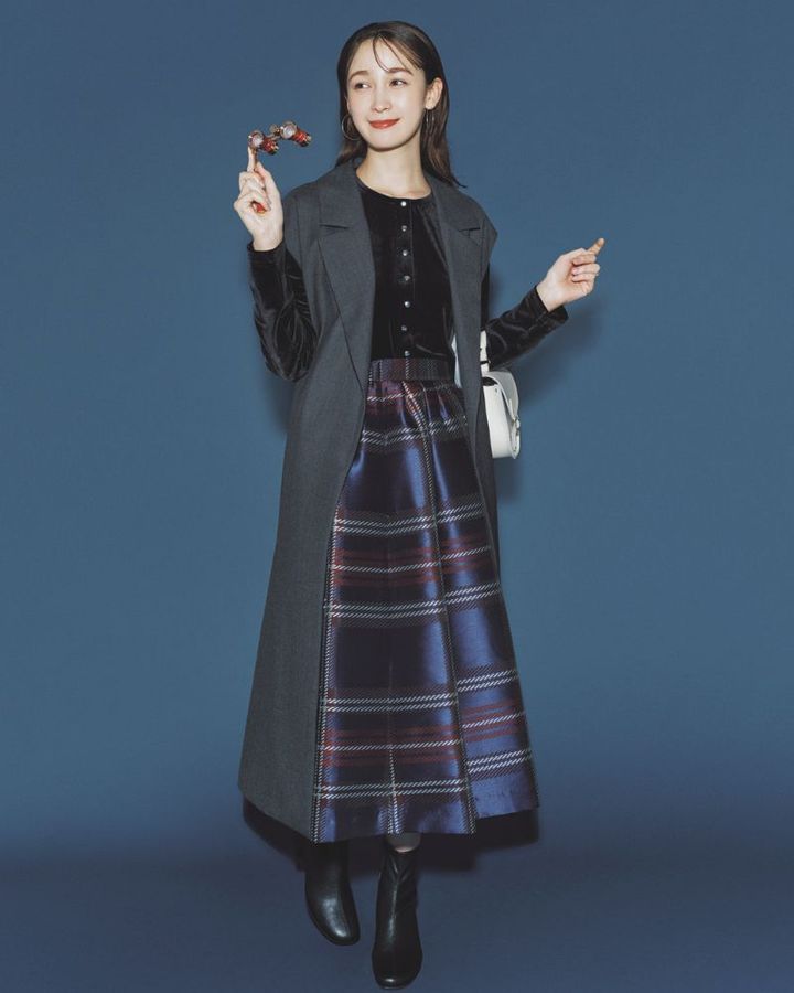 1月23日(木)、立体シルエットで甘く仕上がったチェック柄スカートは、一点投入するだけで着映える主役アイテムですが、子供見えしないよう注意が必要です。たっぷり布を使ったボリューミィなフォルムは、トップスをコンパクトな黒カーディガンで合わせて、フィット&フレアの好バランスに。さらにロングジレを投入してIラインを強調すると、スタイリッシュで大人っぽく引き締まります。