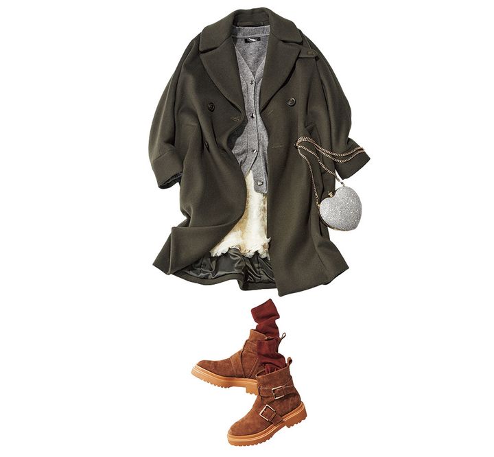 ブーツ〔H4cm〕¥161,700(ピエール アルディ/ピエール アルディ 東京)ストール付きコート¥110,000(DES PRS/DES PRS)ニット¥16,940(メゾンスペシャル/メゾンスペシャル 青山店)スウェットパンツ¥20,900(ナゴンスタンス)バッグ¥35,200(プンティ/エルディスト)サングラス¥53,900(アイヴァン/アイヴァン 東京ギャラリー)ブレスレット¥17,600(アドラル/ZUTTOHOLIC)