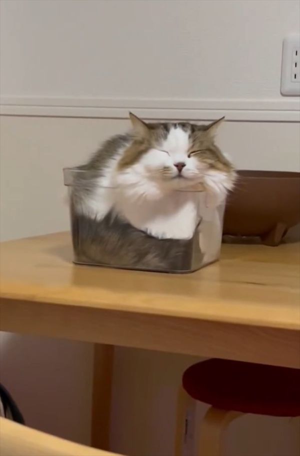 「ネコは液体」と言われることもありますが、このフィット具合はたしかにどのような体勢でおさまっているのか不思議になると共に、液体なのではと疑いたくもなってしまいますね。