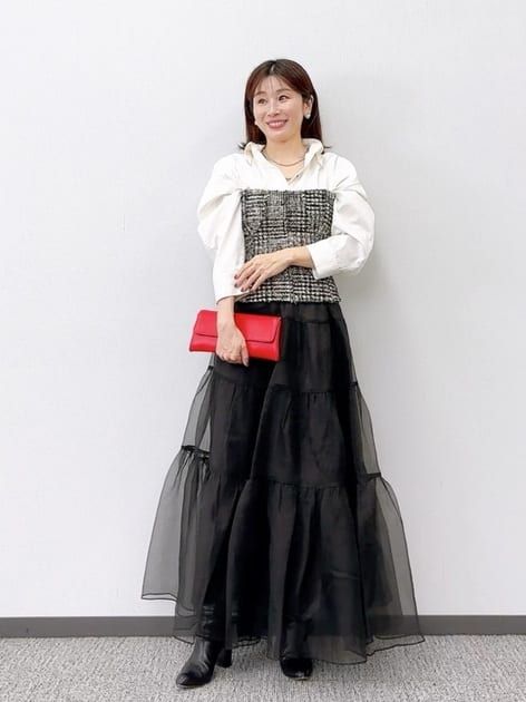 ティアードデザイン×チュール素材が華やかで可愛らしいスカートを主役にしたこちら。赤のバッグが女性らしさを際立たせ、コーデを引き締めるアクセントに。トップスにビスチェを合わせたトレンド感と気品を兼ね備えたスタイルです。