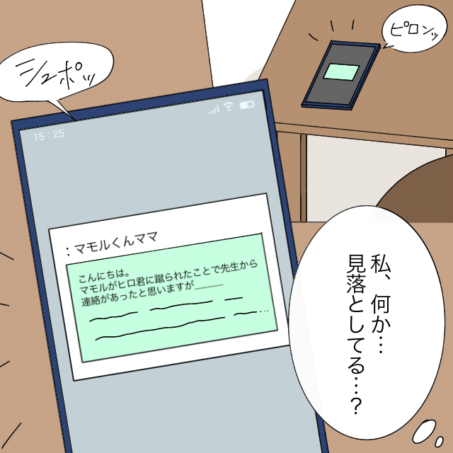 そして、「私、何か見落としてる・・?」あかねさんが思いを巡らせていると、「シュポッ」「マモル君ママ: こんにちは。マモルがヒロくんに蹴られたことで先生から連絡があったと思いますが・・」マモル君のママからメッセージが届いたのでした。
