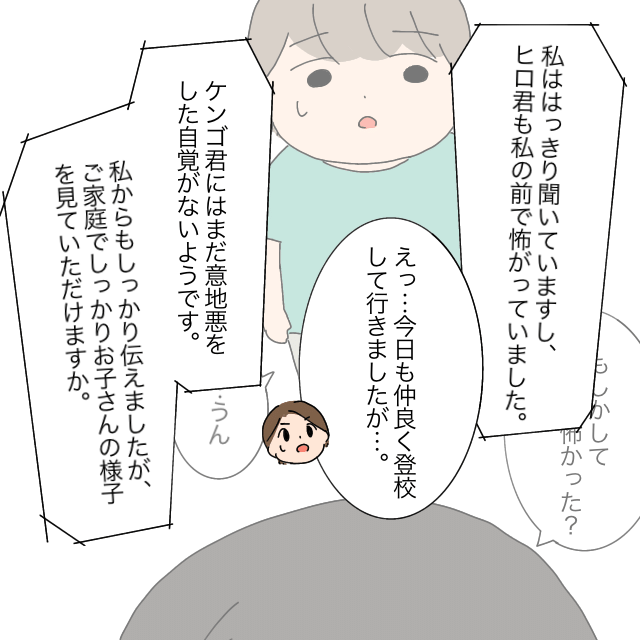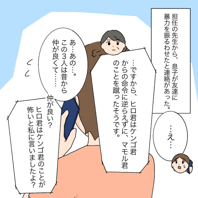 担任の吉村先生から、ケンゴ君が友達に暴力を振るわせたと連絡を受けたあかねさんが驚いていると、「・・ですから、ヒロ君はケンゴ君からの命令に逆らえずに、マモル君のことを蹴ったそうです」吉村先生にそう言われて、「あ・・あの・・。この3人は昔から仲が良くて・・」動揺しながらあかねさんが答えると、「仲が良い?ヒロ君は、『ケンゴ君のことが怖い』と私に言いましたよ?」と反論する吉村先生。