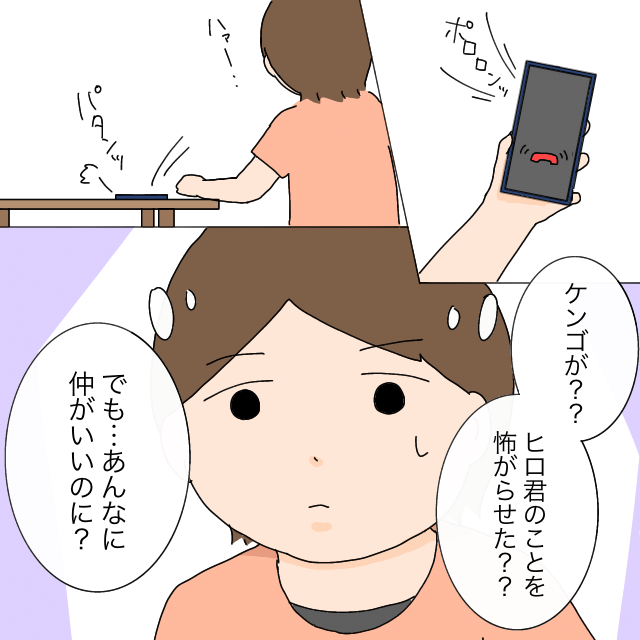 電話を切った後、「ケンゴが??ヒロ君のことを怖がらせた??でも・・あんなに仲がいいのに?」あかねさんの頭の中で想いがぐるぐると回りはじめました。