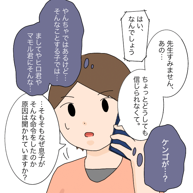 「ケンゴが・・?やんちゃではあるけど、そんなことする子では・・ましてやヒロ君やマモル君にそんな・・」そう思いながら「先生すみません、あの・・ちょっとどうしても信じられなくて」と切り出したあかねさん、「・・そもそもなぜ息子がそんな命令をしたのか、原因は聞かれていますか?」と言葉を続けました。