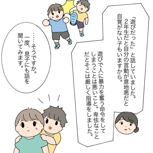「『遊びだった』と話していました。2年生だと自分の言動が意地悪だと自覚がない子もいますから。遊びで人に暴力をふるう命令をしてしまうことは悪いこと。卑怯なことだと、そこは厳しく指導をしました」そう話す吉村先生に、「・・そうですか。一度息子にも話を聞いてみます」と伝えたあかねさん。