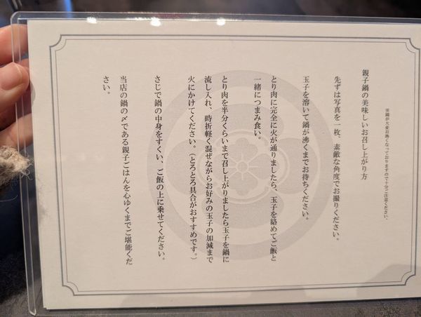 注文すると、店員さんに「こちら、良かったら料理が届くまでに読んでみてください」と言われた「すき焼き仕立ての親子鍋のおいしい食べ方」