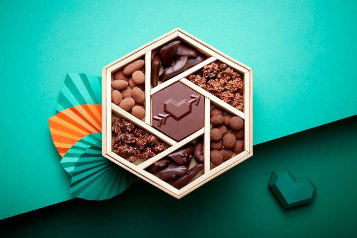 ル・ショコラ・アラン・デュカスが推す、7種の絶品ショコラが六角形の大きなボックスに詰まっている、ショコラ好きには堪らない限定ボックス。ハートのデザインが施された「バレンタイン限定ショコラ」のほか、アーモンドやヘーゼルナッツをショコラでコーティングした「ドラジェ」、ドライフルーツやシリアルパフ、薄く焼いたクレープ生地をショコラと合わせた「ロック」などの人気のショコラが勢ぞろいしています。