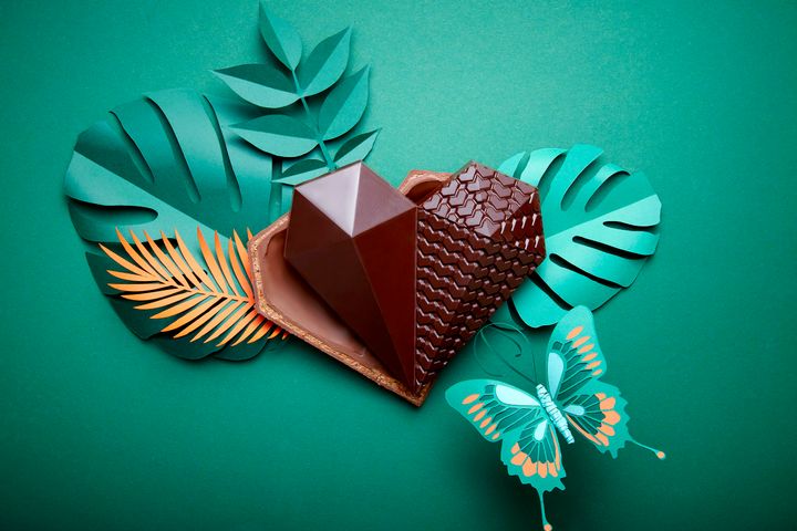 幾何学デザインが人気のハート型ショコラ。今年はフランボワーズのガナッシュを詰めた「カカオ75%のショコラ」、レモンのガナッシュとヘーゼルナッツのプラリネを2層に重ねた「マーブル仕立てのショコラ」、香ばしいイタリア産ピスタチオのプラリネがたっぷり入った「カカオ45%ショコラ」の3 つのフレーバーを詰め合わせています。