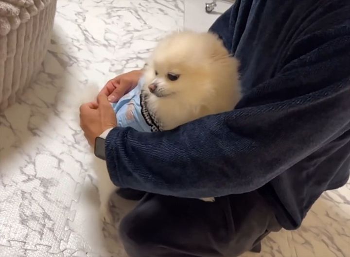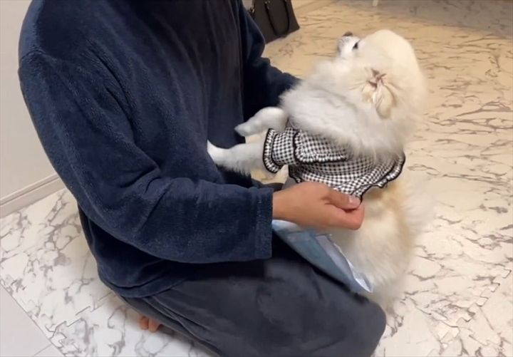 そんな賢いぽんちゃんですが、オムツの装着が終わると今度は「だっこして~」と飼い主さんに甘えはじめました。 甘える姿も愛らしいですね~。