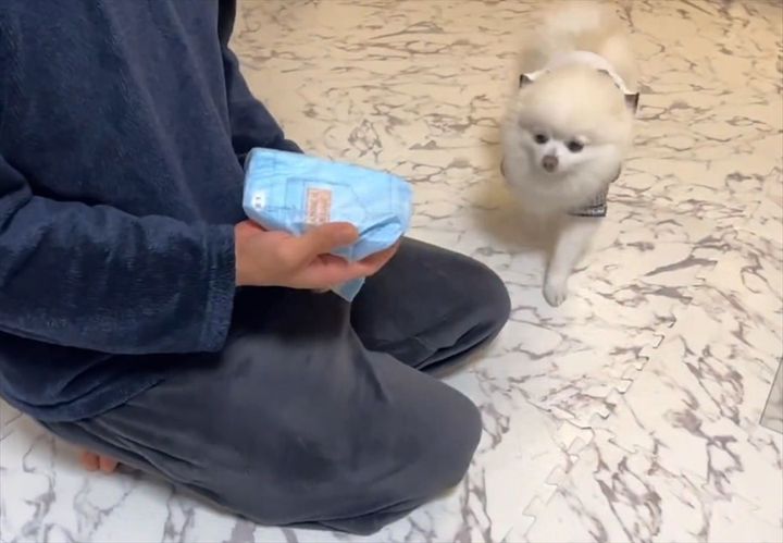 「オムツつけるよー!」と飼い主さんが呼ぶと、トコトコやってきたのはポメラニアンの『ぽん』ちゃん。