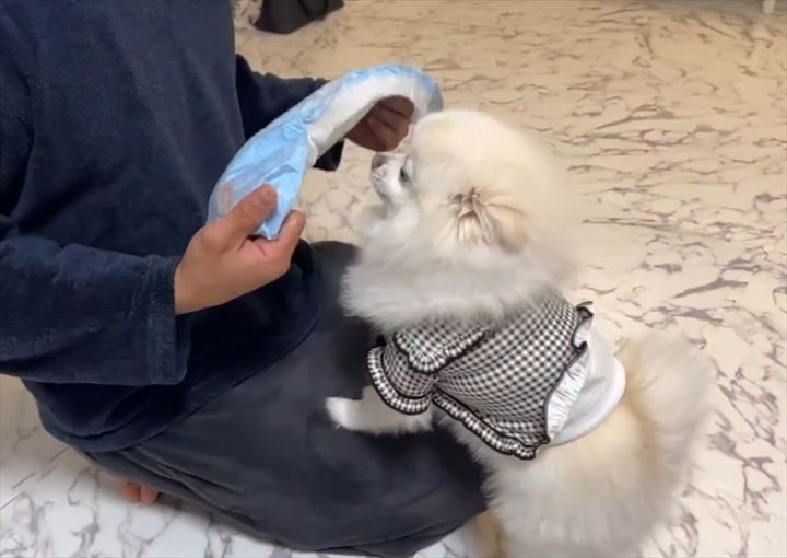 オムツをつけやすいように、自分から協力してくれる賢いポメラニアン。 この子がオムツを履いた後に飼い主さんに甘える様子も必見です!