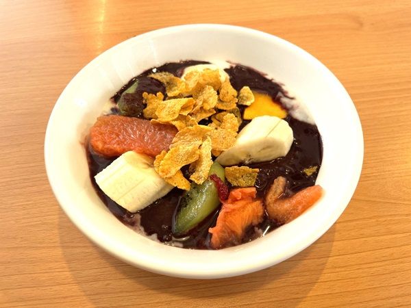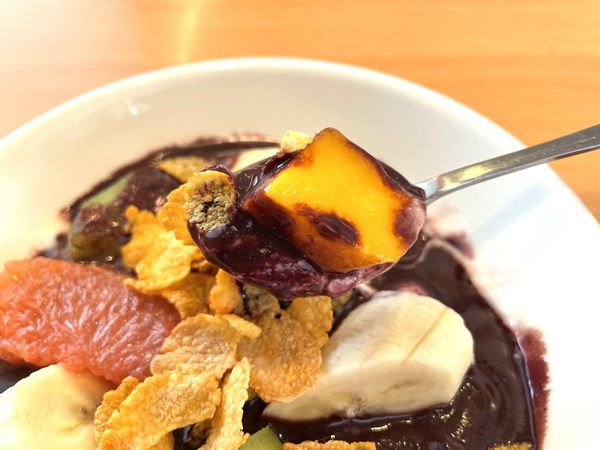 バナナ、ピンクグレープフルーツ、キウイ、マンゴー、ミックスベリーなどのフルーツがたっぷり! 全部大きめにカットされているので食べ応えもすごいです。またアサイーの下にはヨーグルトもたっぷり入っていてボリュームがあります。コーンフレークのサクサク食感も楽しい。アサイー自体はかなりさっぱりしています。とろみがあってヨーグルトと合わせるとヨーグルトの酸味と風味のほうが勝りました。
