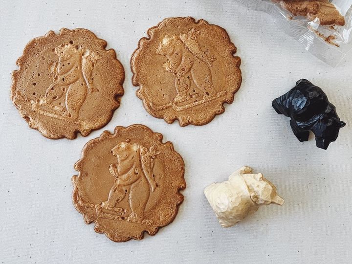 厳選バターとミルクを使った洋風せんべい。北海道で熊をさす愛称〈山親爺〉から名づけられており、パリッとした口溶けのよさが人気。スキー板をはいて鮭を背負う熊のレリーフも印象的です。