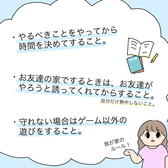 「やるべきことをやってから時間を決めてすること」「お友達の家でするときは、お友達がやろうと誘ってくれてからにすること(自分だけ熱中しない)」「守れない場合はゲーム以外の遊びをすること」これを「わが家のルール」としたのでした。