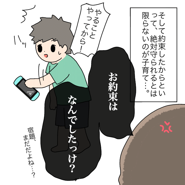 そしてその後のこと。「やることやってから!!」「お約束はなんでしたっけ?」という翠さんの声に驚くタクくんは、宿題もやっていないのにゲーム機に手を伸ばしたせいで翠さんに注意されてしまったのでした。約束したからといって、絶対守られるとは限らないのが子育て・・ですね。