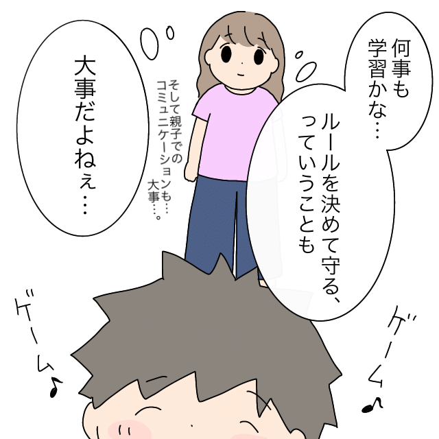 「ゲーム!ゲーム!」とうれしそうにするタクくんを見ながら、「何事も学習かな・・ルールを決めて守るっていうことも大事だよねぇ・・そして親子のコミュニケーションも大事・・」と心の中で呟く翠さん。