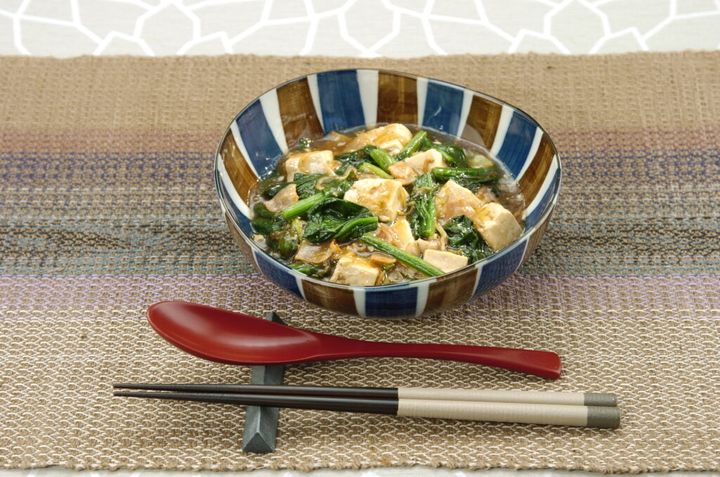 この日のテーマは「栄養豊富!ほうれん草」。今が旬のほうれん草にベーコンと豆腐を加え、食べごたえのあるおかずに仕上げた「豆腐とほうれん草のうま煮」を辻調理師専門学校の簾達也先生から教わった。