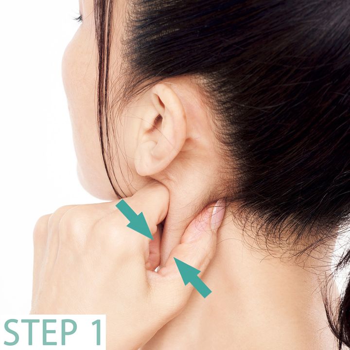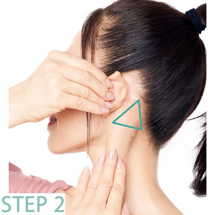 STEP 2:「い」の口で横を向くと、耳の後ろに胸鎖乳突筋の上部「停止部」が登場。そのライン上を摑めればOKです。