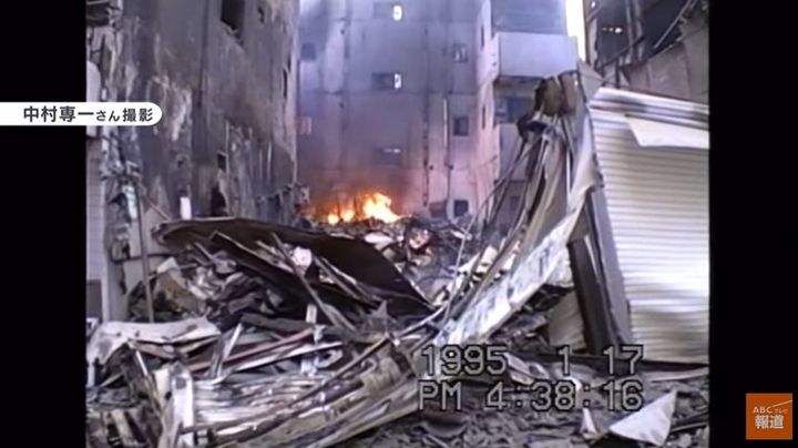 震災発生からおよそ11時間後、午後4時半すぎの映像が残っています。瓦礫の山と化したJR新長田駅付近に佇む人。背後には火の手が上がっています。場面は変わって、両側の建物が崩れ落ちた商店街を歩く被災者たち。カメラを回す中村さんに「怖いね」と不安げに話しかける女性もいます。