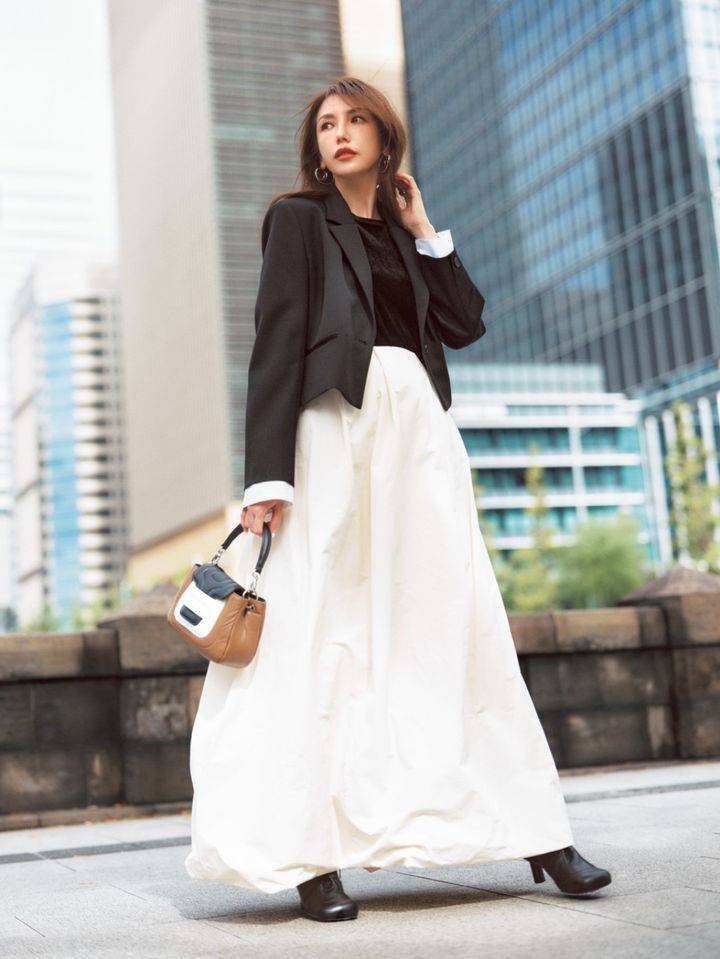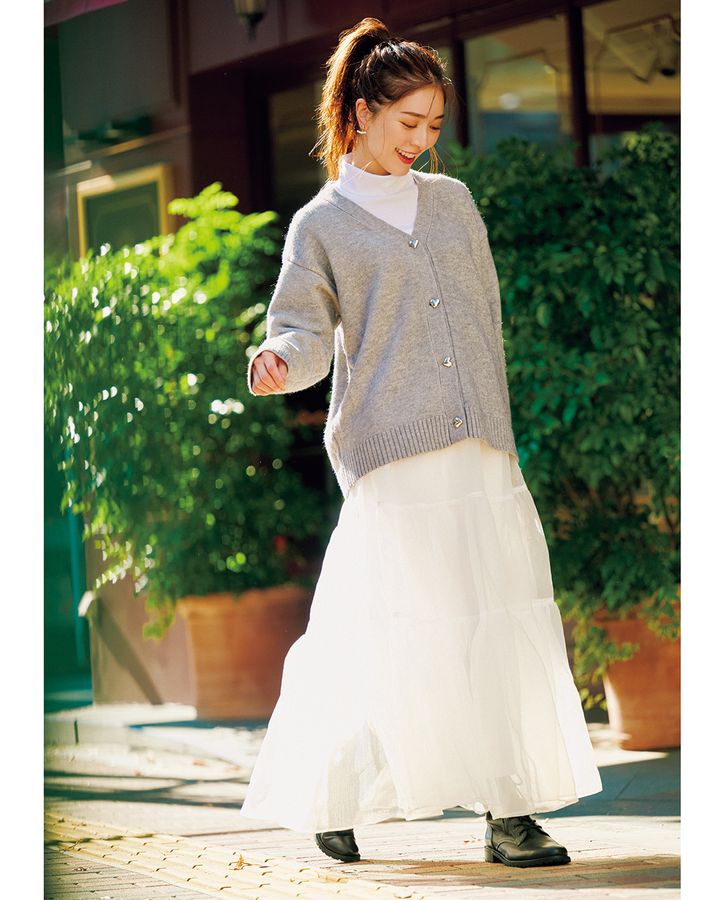 カーディガン¥99,000スカート¥55,000(ともにデパリエ/デパリエ 伊勢丹新宿店)ショルダーバッグ¥57,200(MIUUR/LE PHIL NEWoMan 新宿店)ブーツ¥18,700(ル タロン/ル タロン 有楽町マルイ店)ピアス¥36,740(ベン・アムン/ズットホリック)バングル¥220,000(ウノアエレ)リング[左手人差し指]¥27,500(Pearl for Life/ロードス)リング[3個SET販売・左手薬指]¥52,800(ミショー/ハウス オブ ロータス)