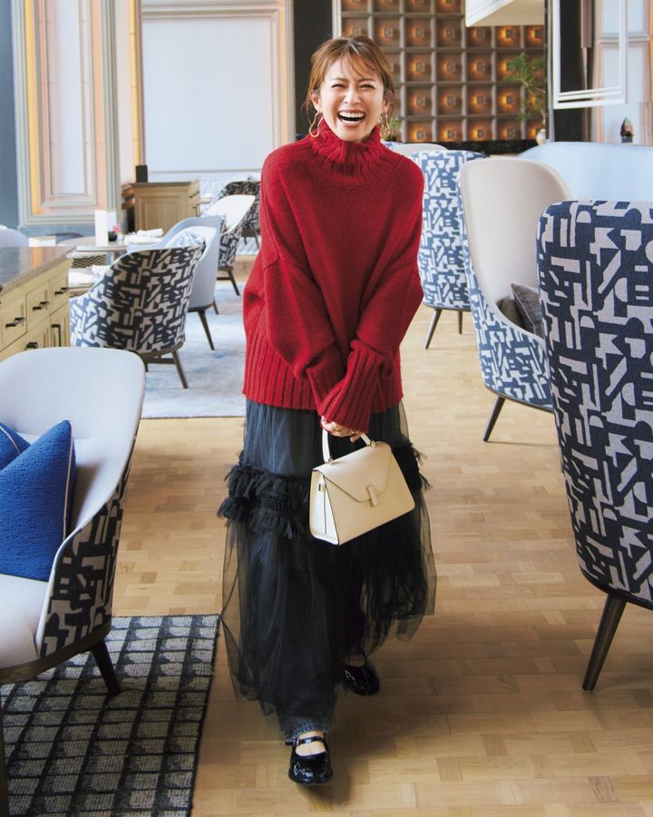 ニット¥28,600(HER.)チュールスカート¥24,200(メゾンスペシャル/メゾンスペシャル 青山店)デニムパンツ¥44,000(ハイク/ボウルズ)ハンドバッグ¥572,000(ヴァレクストラ/ヴァレクストラ ジャパン)パンプス¥145,200(ピエール アルディ/ピエール アルディ 東京)ピアス¥33,000(ブランイリス/ブランイリス トーキョー)リング[左手人差し指]¥20,350(ソコ/ズットホリック)リング[3個SET販売・左手薬指・右手薬指]¥52,800(ミショー/ハウス オブ ロータス)