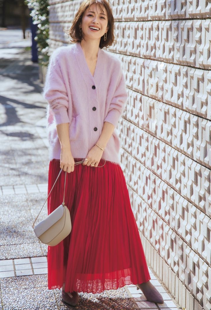 深めの赤をアクセントに、フェミニンなピンクを効かせて優しくまとめて。