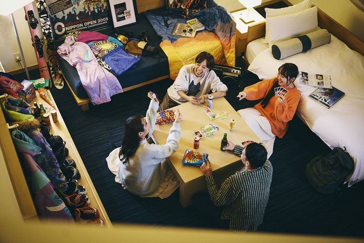 ゲレンデでたっぷり滑った後は、レトロなグッズがちりばめられた部屋で仲間と楽しいひと時を。客室は最大5名まで宿泊可能なメゾネットタイプの客室なので、仲間とのステイも快適♪