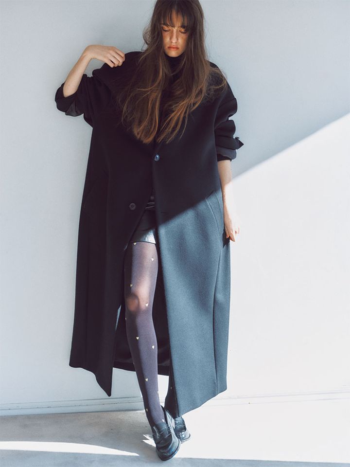 【POINT】コートの隙間からキャッチーなハートのタイツをのぞかせれば、ほぼ1枚でも十分高い満足感。飾り気はタイツに託せば、あとはいつもの黒コートのシルエットを生かすように着るだけでさまになるシンプルに。