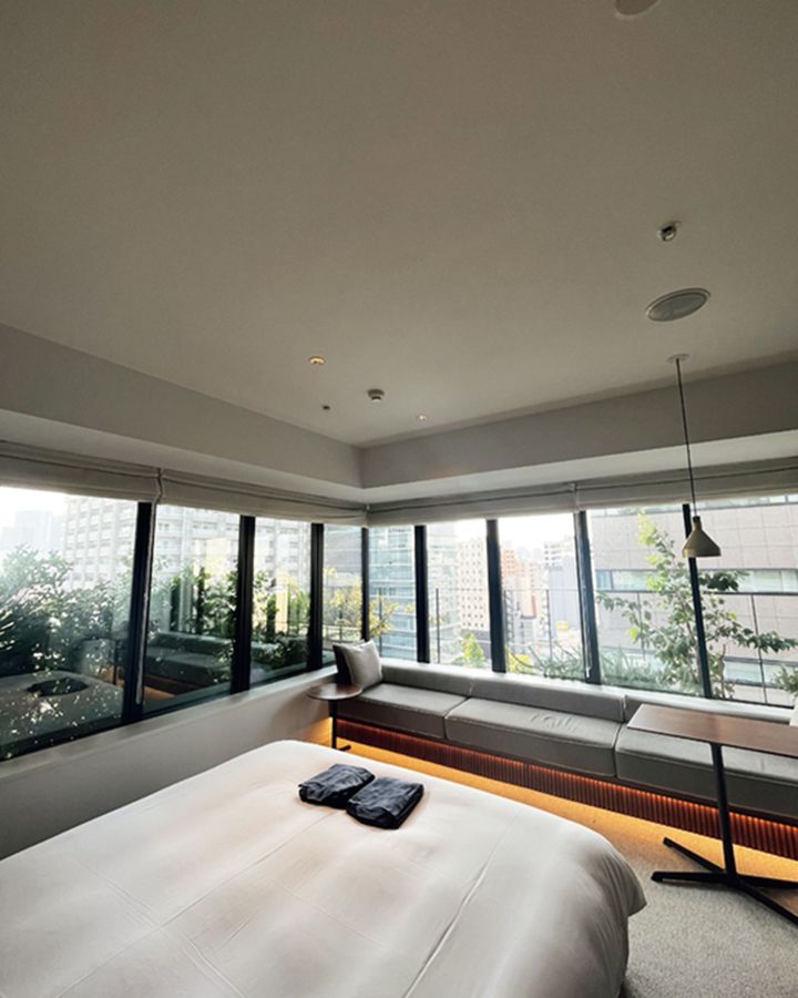 「モスグリーンと白で統一された落ち着いた空間が素敵で、シンプルな美しさへのこだわりを感じます。間接照明で照らされたロビーは居心地がよく仕事が捗るので、環境を変えて原稿を書きたいときに一人で泊まることもあるんです」(岸本真由子さん/ライター)