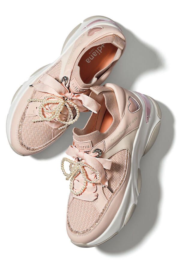 パールリボンのチャームやきらめく装飾など、フェミニン派でも使いやすい甘めディテールのスニーカー。