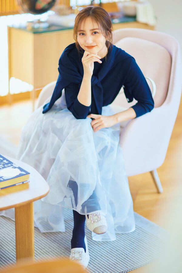 華やかなエアリースカートに上品カラーのアンサンブルでこなれ感をプッシュ