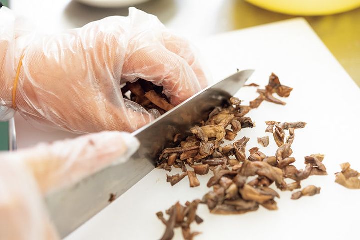 ずいきは煮ると膨らむため細かく切って、だんごはほどよいかたさに仕上げるのがコツだそう。たまに昼食で作っている、と話す上滝さん。