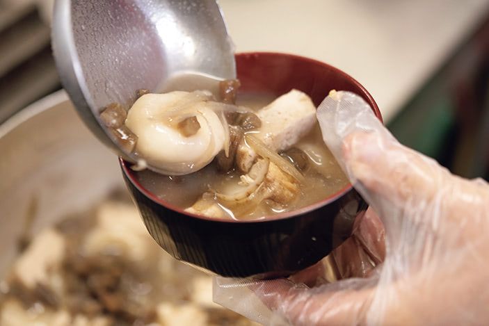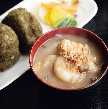 ❹ だんごが浮いてきたら、みそを溶き入れ味をととのえる。わんに盛って、花がつおをちらす。