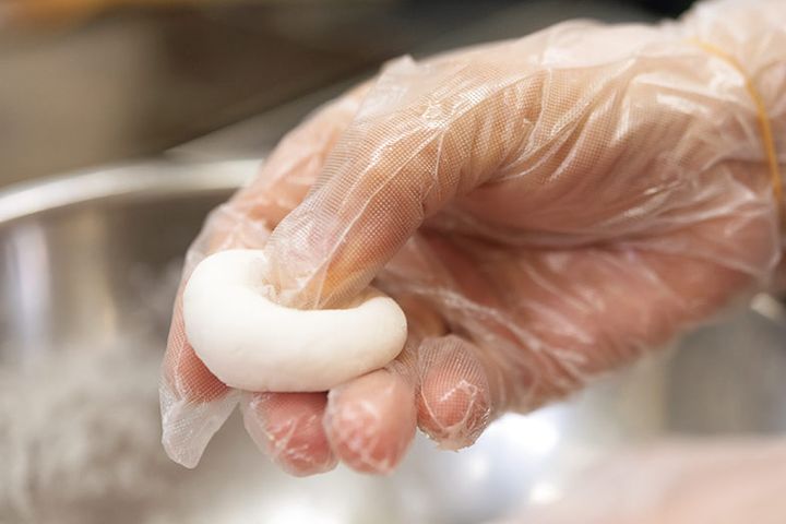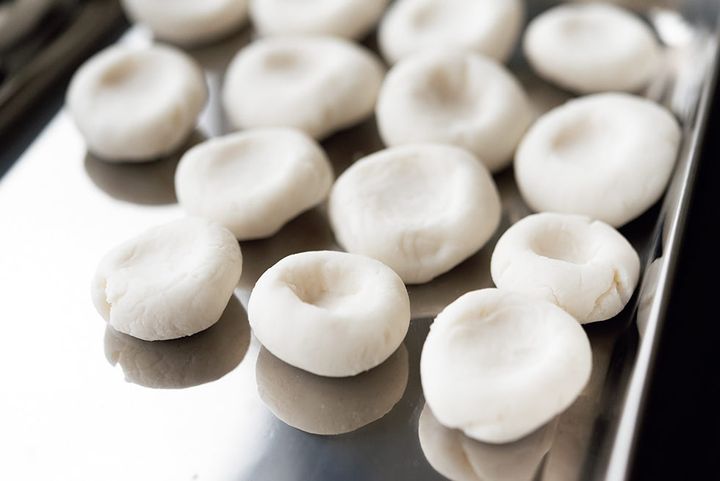 ❷ もち米粉をボウルに入れ、湯を少しずつ加えながら練って耳たぶぐらいのやわらかさに。一口大に丸め、真ん中にくぼみをつける。
