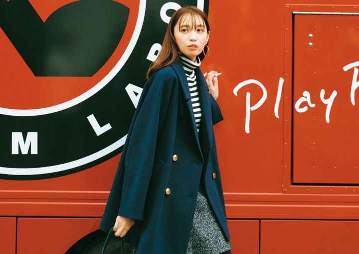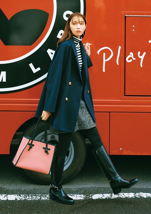 ピーコート¥12,980/グローバルワーク(アダストリア) ツイードセットアップ(スカパン)¥18,700/アルページュストーリー ボーダータートル¥4,389/ロペピクニック(ジュン) ショルダーバッグ¥37,400/ジャンニ キアリーニ(ジャンニキアリーニ 銀座店) ロングブーツ¥39,600/ダイアナ(ダイアナ 銀座本店) フープピアス¥64,900/モニス(フォーティーン ショールーム)