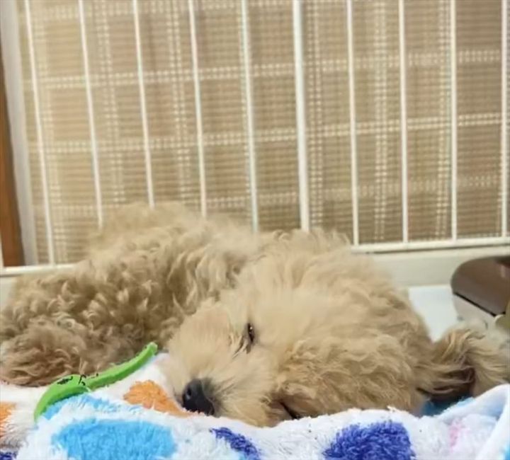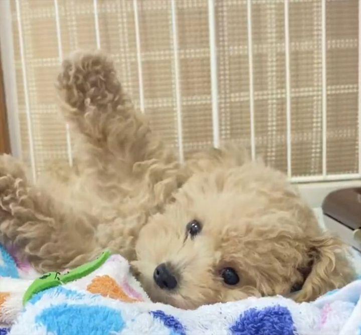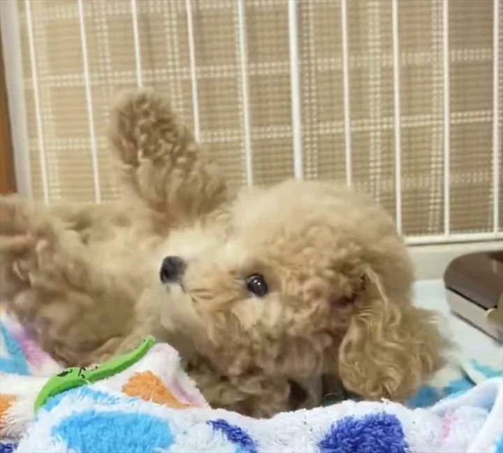 仰向けになって横になっているのは、トイプードルの『ぽむ(Pomme)』くん。 安心しきった様子で、ウトウトしているのがかわいいですね~。