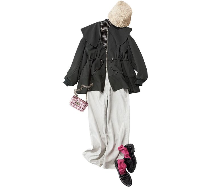 重心になって重めアウターとのバランスもよく、スタイルアップにも一役。