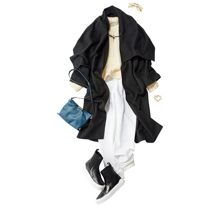 ブーツ〔H4cm〕¥161,700(ピエール アルディ/ピエール アルディ 東京)ストール付きコート¥110,000(DES PRS/DES PRS)ニット¥16,940(メゾンスペシャル/メゾンスペシャル 青山店)スウェットパンツ¥20,900(ナゴンスタンス)バッグ¥35,200(プンティ/エルディスト)サングラス¥53,900(アイヴァン/アイヴァン 東京ギャラリー)ブレスレット¥17,600(アドラル/ZUTTOHOLIC)
