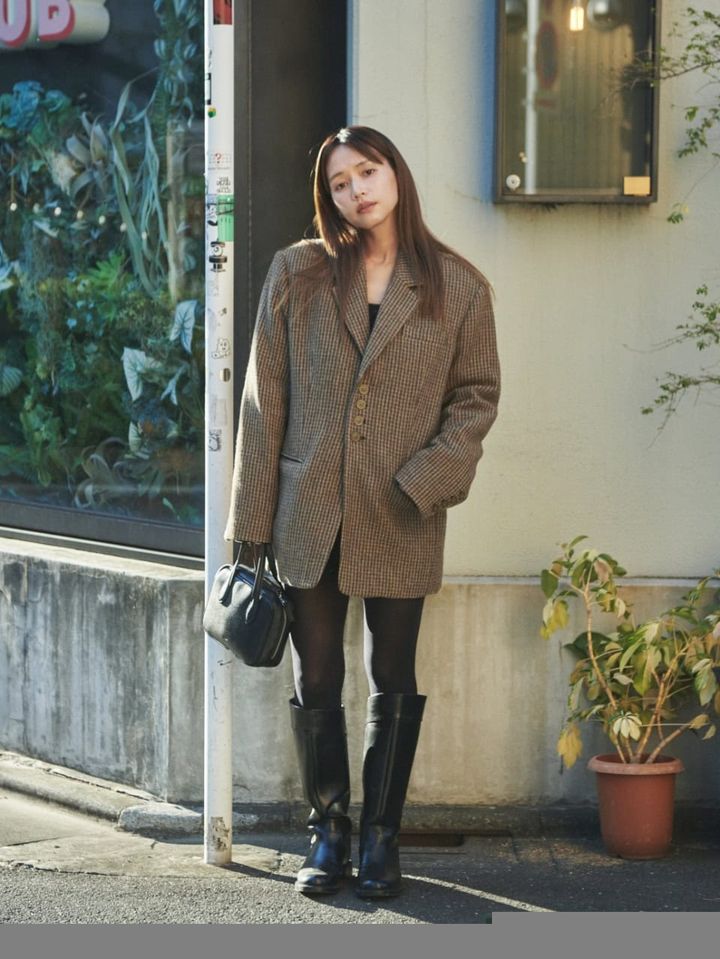 「大きいサイズ感がポイントのジャケットに、ブーツを合わせてトラッドなコーディネートにまとめました。ミニ丈のボトムを合わせることで、スタイリングにヌケ感が出るようにしています」