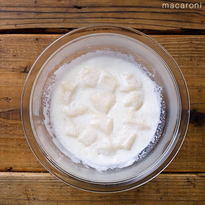 2: 耐熱ボウルに①と牛乳を入れて、レンジ600Wで3分〜3分30秒加熱します。